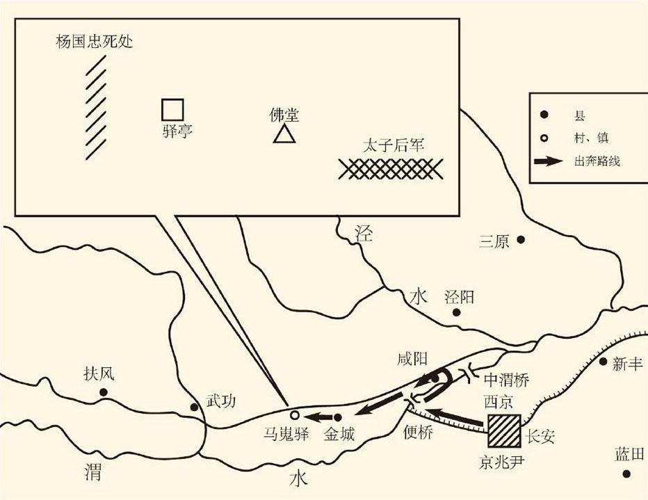 可惜兄妹二人都没想到,他们根本就回不了成都。这两个人跟着唐玄宗逃出长安才一天半,就被杀死在京城一百多里外的马嵬驿(嵬读如委),也叫马嵬坡。(马嵬驿在今陕西省兴平市境内,距离当时的金城县约二十八里,而金城距离长安八十五里。)