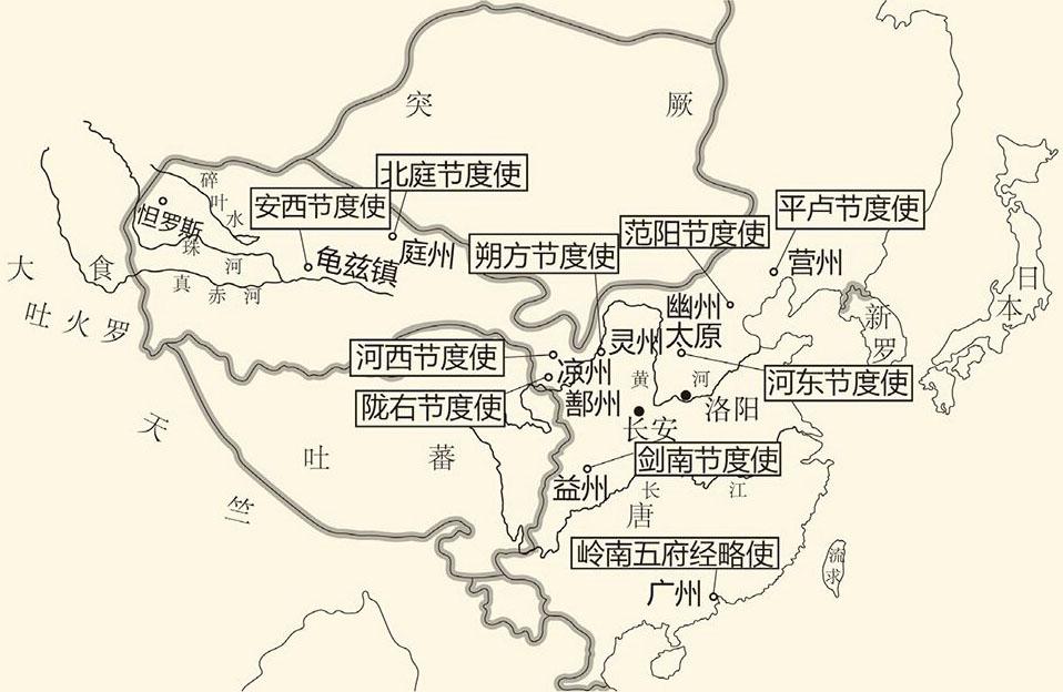 最早设立的藩镇是十个军区,其中九个军区的长官是节度使,一个是经略使,统称“天宝十镇”。这十个军区有五个在西北,三个在东北,一个在西南,一个在华南,战略目标也很明确:保卫关中,进而保住世界帝国的地位。因此十镇的总兵力竟多达四十九万,是中央军的五倍半。(本段及下页表均据《资治通鉴》卷二百一十五天宝元年正月条。)